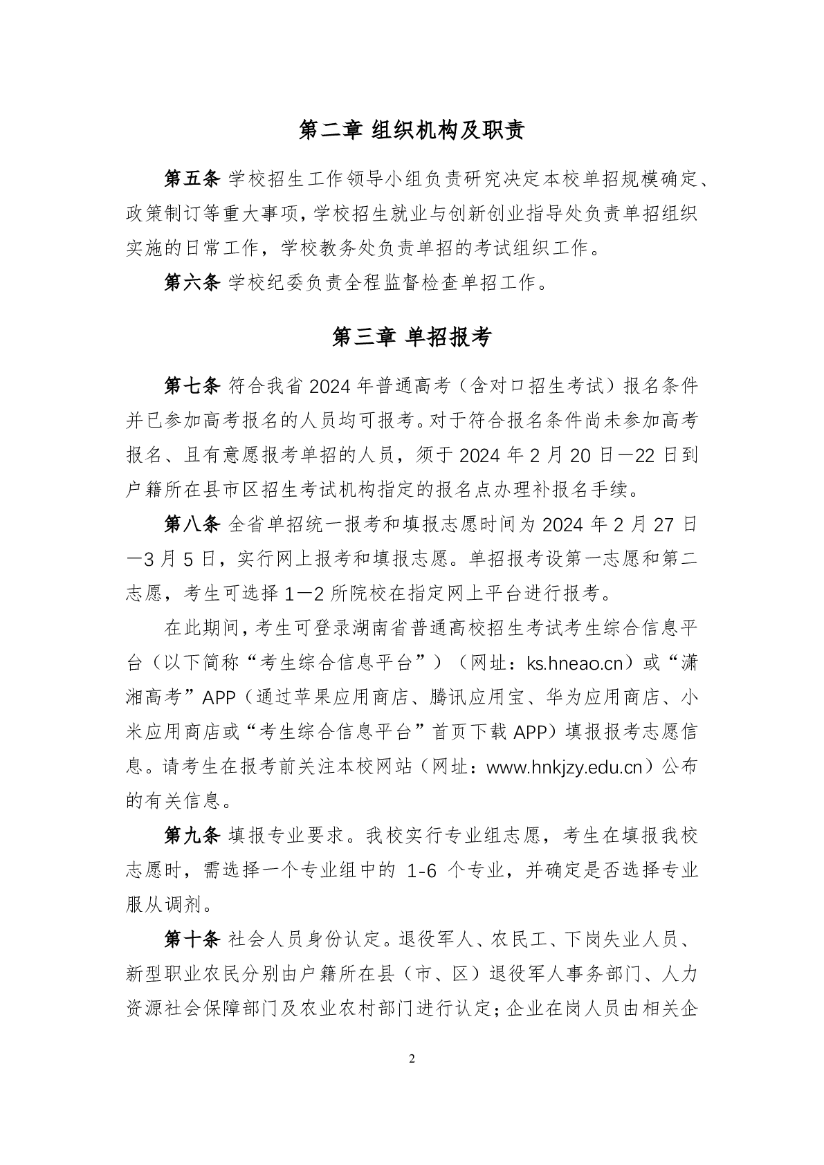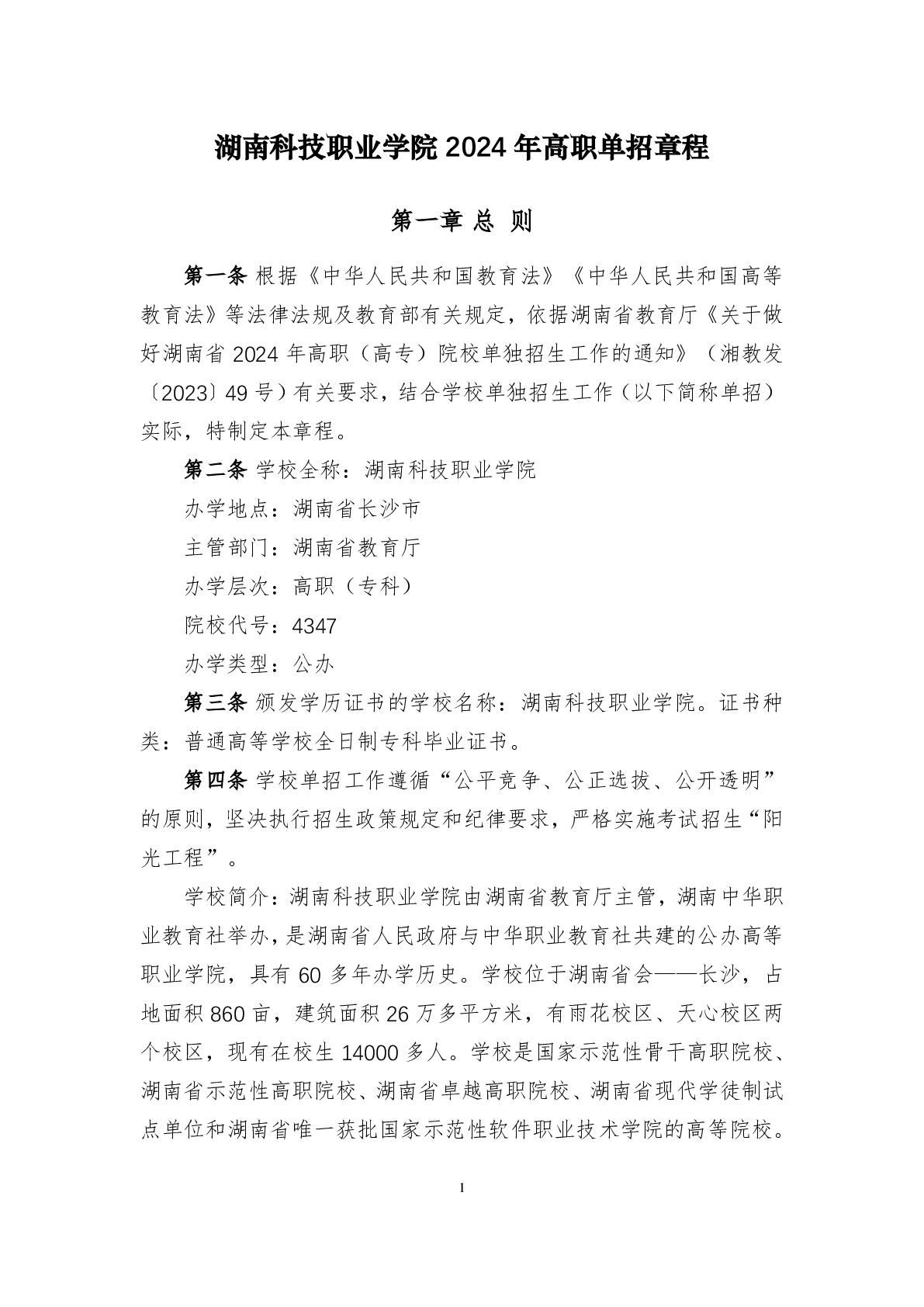 湖南科技职业学院2024年高职单招章程