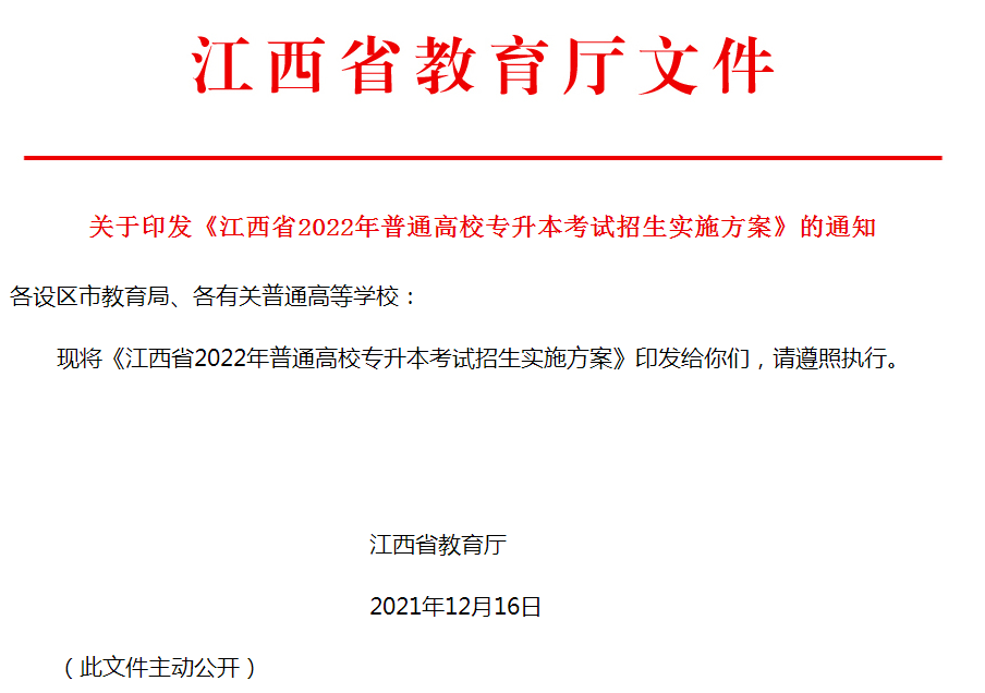 江西省2022年普通高校专升本考试招生实施方案公布,2022年全省统一组织命题、制卷、评卷。专升本考试科目包括公共基础课和专业基础及技能知识课。公共基础课不分学科专业,采用政治+英语+信息技术三门课程的综合卷,分值300分。专业基础及技能知识课按专业门类分为9类,各设置一门考试科目,各考试科目试卷分值150分。全省普通高校专升本考试工作原则上于4月底前完成。具体如下