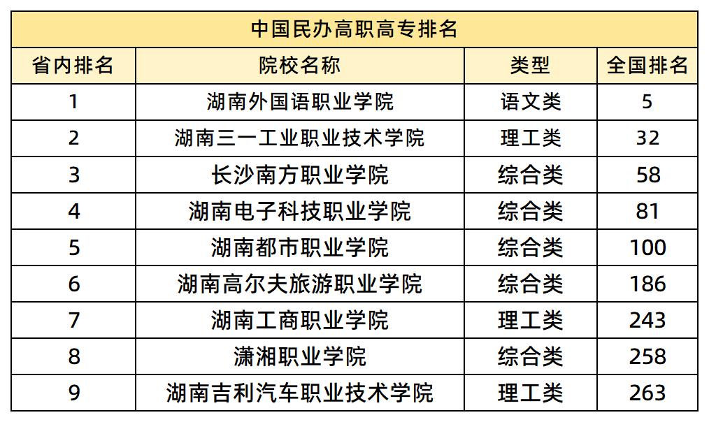 长沙民政职业技术学院在全国公办高职高专中排名第4。湖南外国语职业学院在全国民办高职高专排名第5。