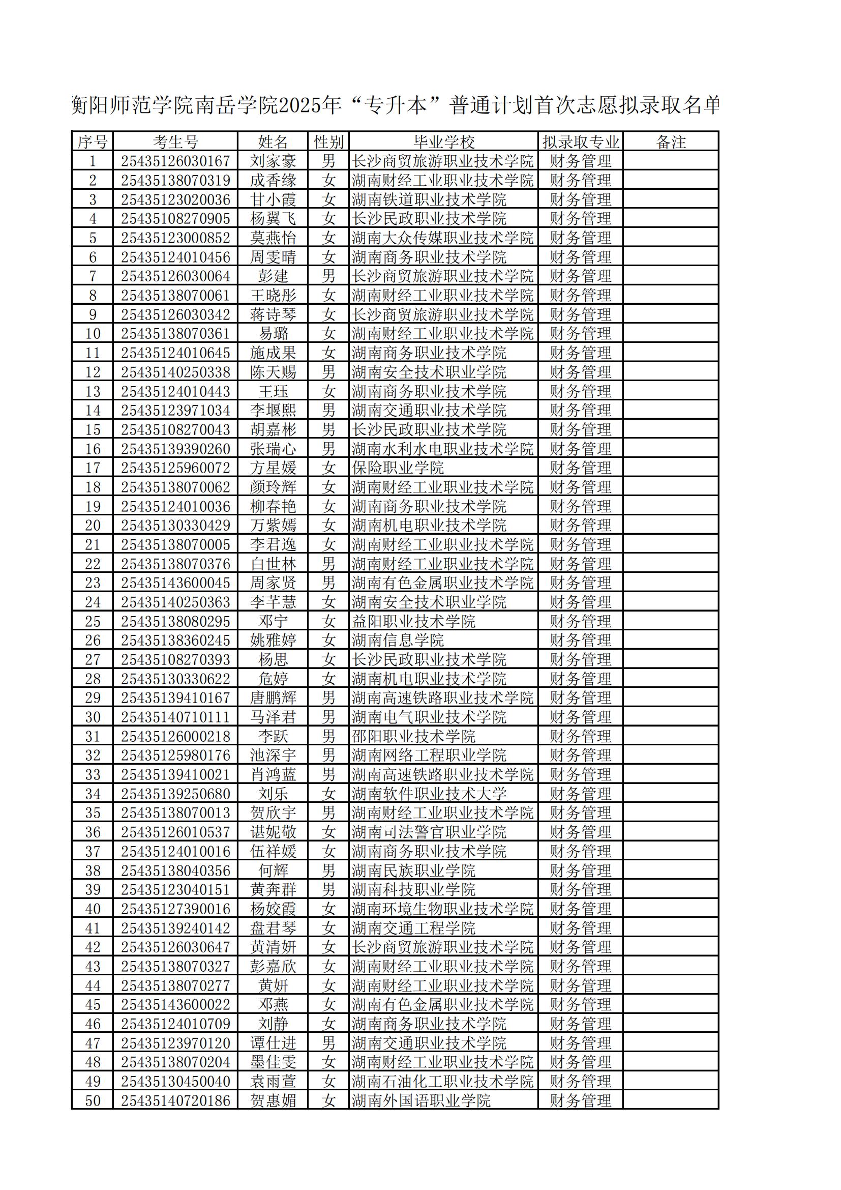 根据湖南省教育厅《关于做好2025年湖南省普通高等学校专升本考试招生工作的通知》(湘教发[2024]54号)、《衡阳师范学院南岳学院2025年“专升本”招生章程》等相关规定,经省教育考试院审核通过,现将我院首次志愿拟录取结果予以公示,公示期为2025年5月26日-2025年6月1日。若对公示名单有异议,请在公示期内可以通过电话方式或书面材料形式实名向我校反映。联系电话:0734-8486606.